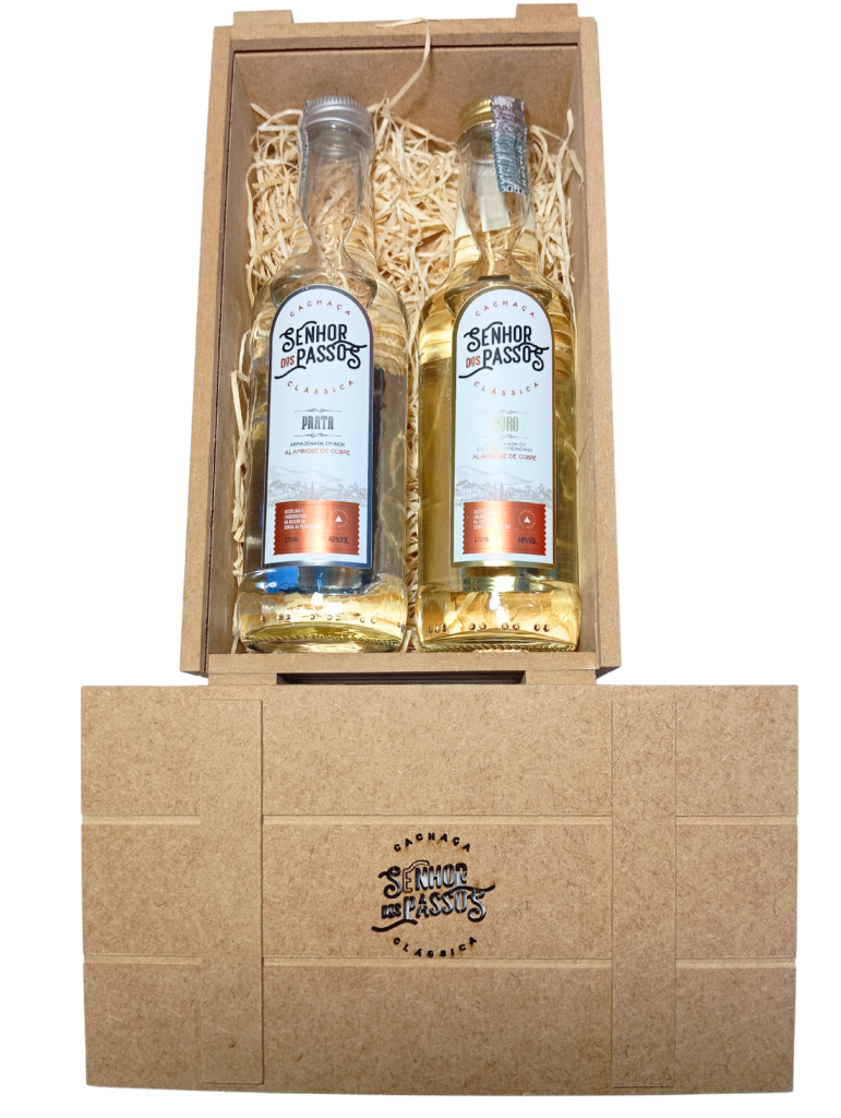 Kit contem :                                                                                                                                                                                                1 Caixa em MDF, personalizada com a Logo da Cachaça Senhor dos Passos vazado +                                                                                        1 Cachaça Prata de 275 ml + 1 Cachaça Ouro (Podendo ser: Carvalho Americano, Carvalho Europeu; Três Madeiras; Jequitibá Rosa) de 275ml